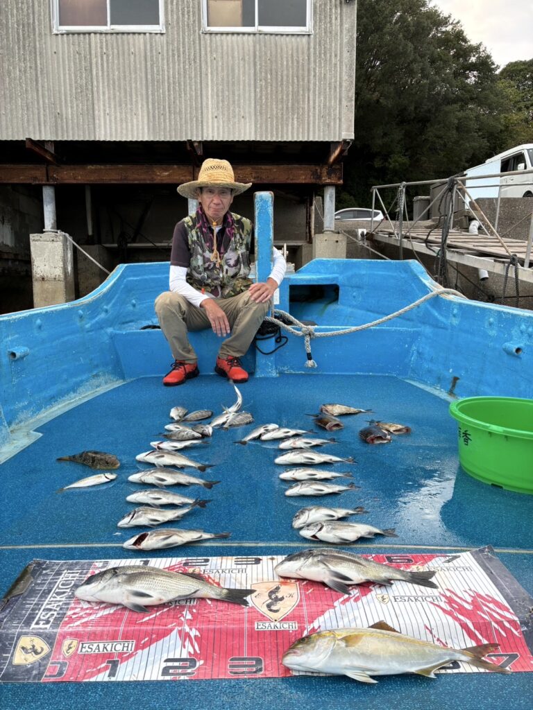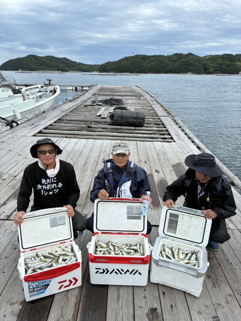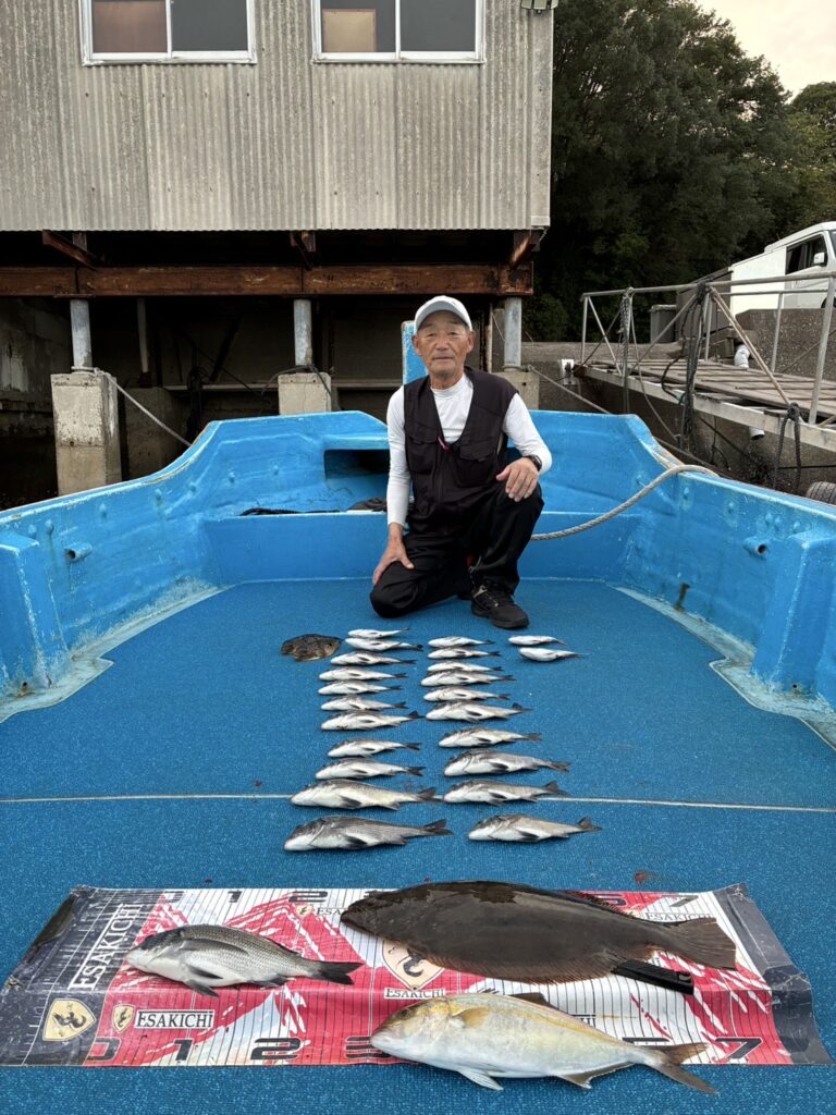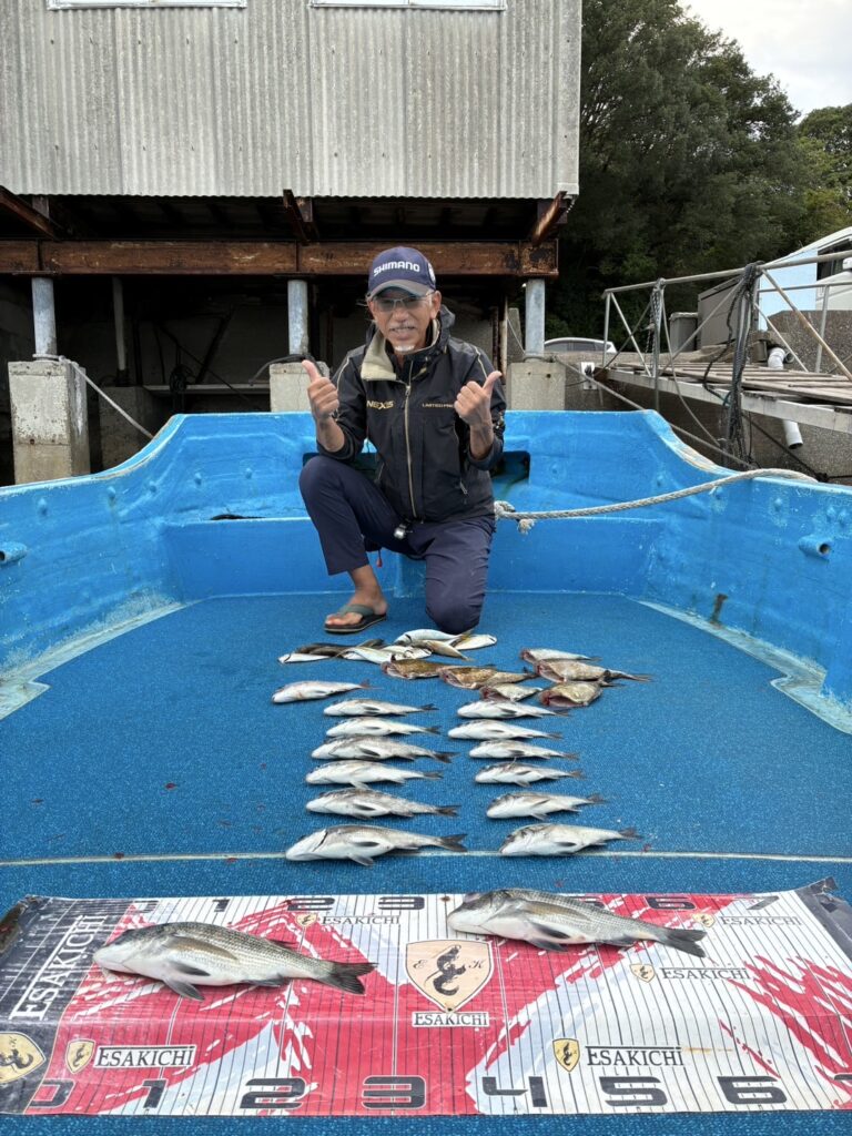 9月29日 本日は午前中予報にない雨が降り、雨風強まる時間帯も。終日風は強くお客様少なかったですが、皆様好釣果でした!チヌは狙われていた方全員2桁枚数‼︎泳がせでは連日のヒラメ+シオ複数!アジ狙いのお客様も、良型多数の大漁ゲットで終えられました‼︎ 2025年釣果 2025.09.29 下山様筏釣り餌:オキアミ、サナギ、コーン、サナギコーン21-32cmチヌ24枚、35cmシオ、アイゴ、フグ、アジ 百南様筏釣り餌:オキアミ、泳がせ21-29cmチヌ22枚、49cmヒラメ、37cmシオ、フグ 工藤様筏釣り餌:サナギ、コーン、オキアミサナギ、オキアミコーン19.5-28cmチヌ14枚、マダイ、アイゴ、アジ 藤田様筏釣り餌:アミエビ(サビキ)アジ大漁