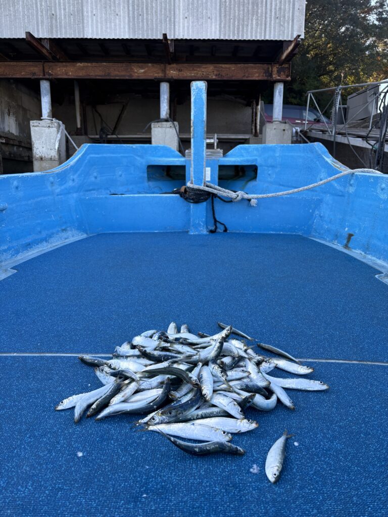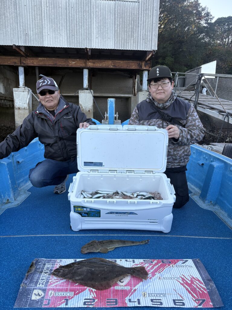 11月26日 本日は爆風予報で、お客様2組のみに。昼前から強まった風は午後には予報通りの爆風となり、どちらも早上がりに。お2組ともヒラメ狙いでお越し頂き、1枚+マゴチがあがりました!イワシはどちらも大漁ゲット‼︎12月1日より練炭貸出開始いたします!