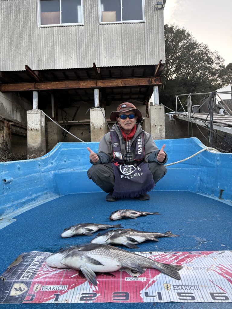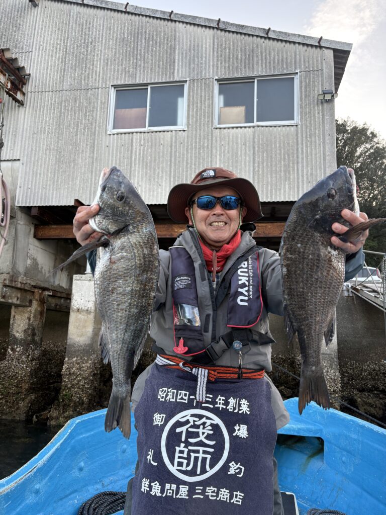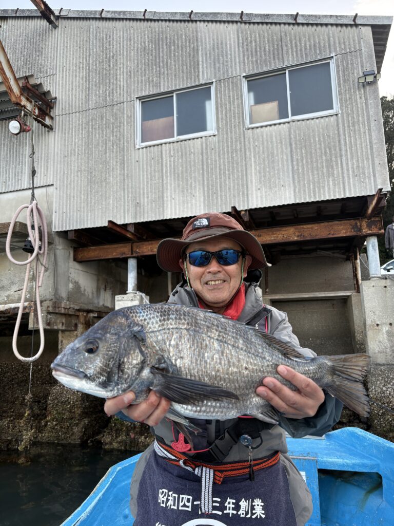 3月27日 本日午前中は風+うねりがありましたが、午後からは収まり釣り日和に!全体として高活性という状況ではないものの、徐々に釣果も伸びてきました‼︎チヌは多数の組でゲットされ、複数組で複数枚+歳無し計3枚!やはり終盤が良かったようです‼︎コノシロも群れで多数! 2026年釣果 2026.03.27 三宅様筏釣り餌:オキアミ43-52.5cmチヌ4枚(52.5cm・51cm歳無し2枚) 大森様筏釣り餌:オキアミ42-47cmチヌ3枚 田中様筏釣り餌:オキアミ51cmチヌ 長谷部様カセ釣り餌:牡蠣45cmチヌ、フグ 川西様カセ釣り餌:牡蠣40.5cmチヌ